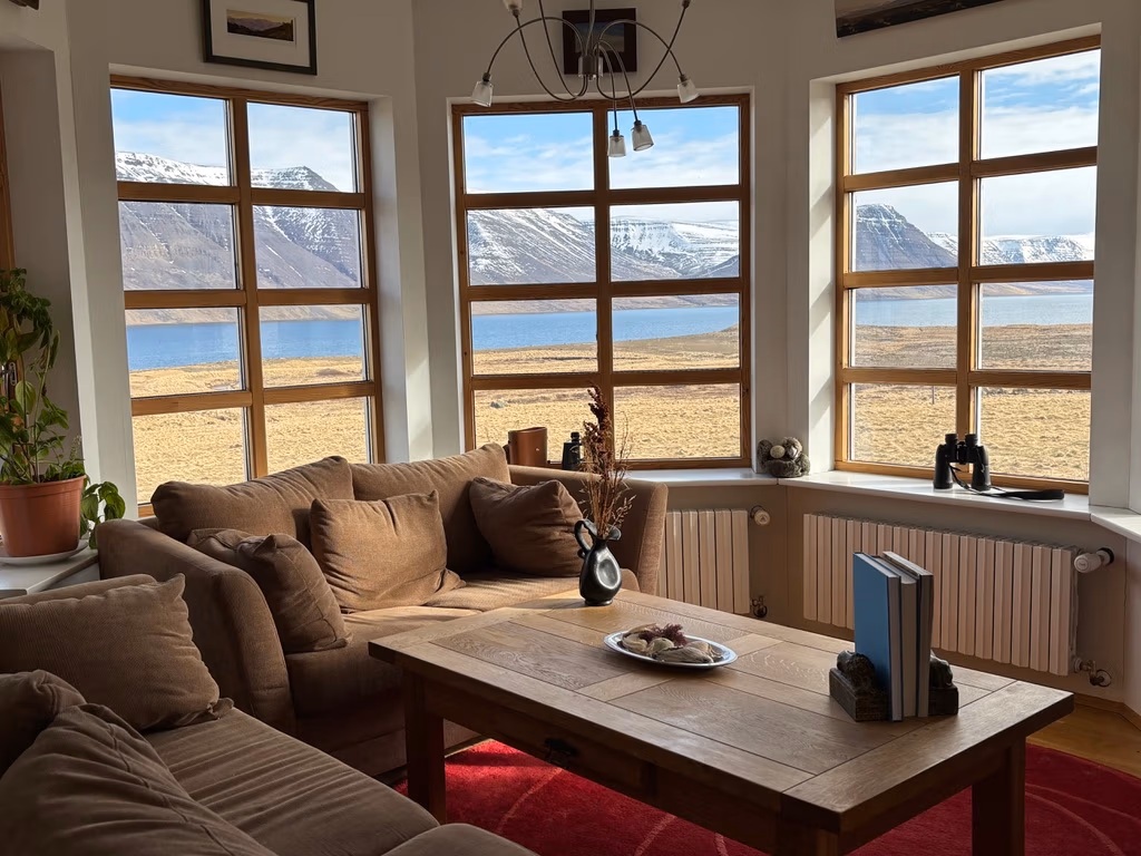 Our comfortable living room is surrounded by large windows with endless views of the fjord and the mountains.
